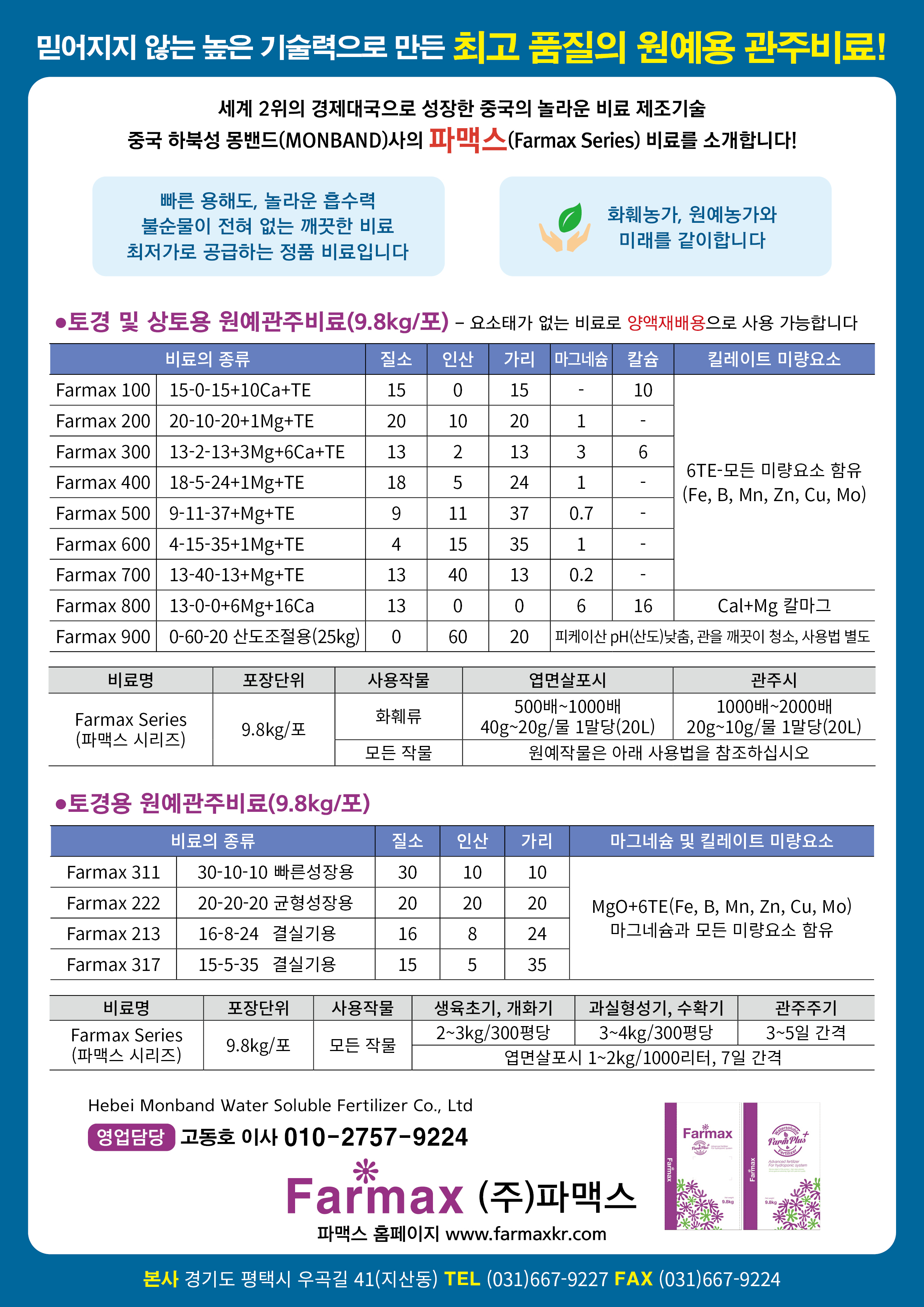 파맥스는 20년 이상의 양액비료 공급 경험을 바탕으로작물과 재배 환경에 꼭 맞는 솔루션을 제안하며농가의 안정적인 생산을 함께 만들어갑니다.